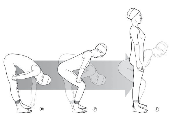 • Оставаясь в согнутом положении, положите руки на колени (В), колени согните. Можно заметить, что при этом частично достигается вертикальное положение туловища (С).