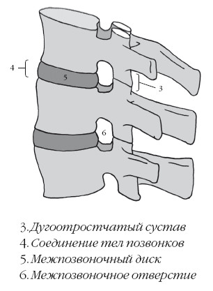Позвонки соединяются друг с другом с помощью двух дугоотростчатых суставов (3) сзади и межпозвоночного диска (5) спереди. Межпозвоночный диск, образованный соединительной тканью, расположен между телами двух смежных позвонков (4).