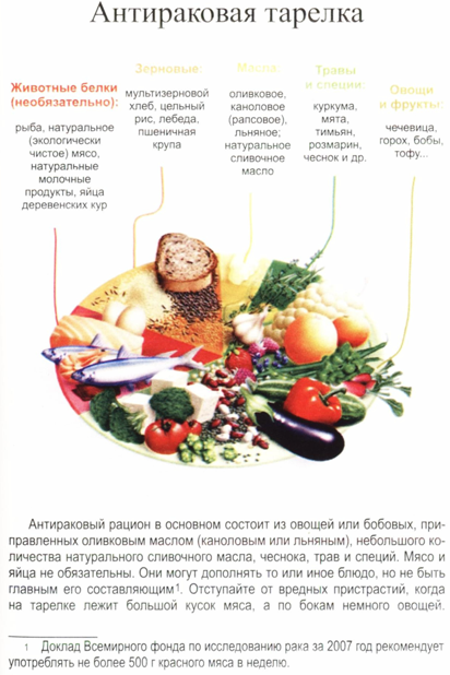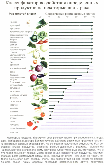 Морковь, ямс, сладкий картофель, разновидности тыквы, томаты, хурма, персики, абрикосы, свекла и все виды яркоокрашенных овощей и фруктов (оранжевые, красные, желтые, зеленые) содержат витамин А и ликопен, которые обладают способностью ингибировать рост клеток нескольких видов рака in vitro, включая клетки глиомы мозга. Лютеин, ликопен, фитоен и кантаксантин усиливают иммунную систему, стимулируют рост здоровых клеток и противостоят росту клеток опухоли. Наблюдения за больными раком груди в течение шести лет показали, что те женщины, которые употребляли много содержащих каротин овощей и фруктов, прожили дольше, чем те, кто этого не делал (73).