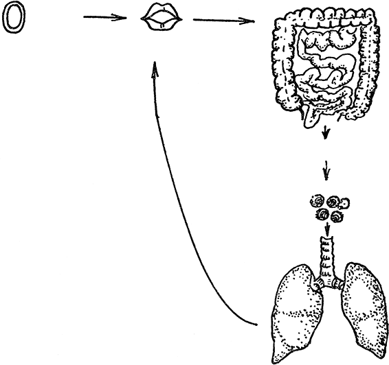 Аскариды и вызываемая ими болезнь аскаридоз – вторая по частоте встречаемости инвазия. Аскариды строго специфичны к человеку и не заражают животных. Аскариды, заражая человека, проделывают сложный путь миграции по организму. Заражение происходит при проглатывании яиц этих глистов. Основным источником заражения считается плохо промытая зелень. При выращивании на земле, удобряемой компостом, в который принято добавлять человеческие фекалии, зелень оказывается загрязненной яйцами этого паразита. Яйца содержат незрелую личинку. В кишечнике личинка выходит из яйца, проникает в кровеносный сосуд и с кровью доходит до легких, где и поселяется (рис. 9). В легких личинка развивается около двух месяцев. При незначительном заражении эта стадия развития протекает бессимптомно, но может вызывать и сухой кашель с загрудинными болями.