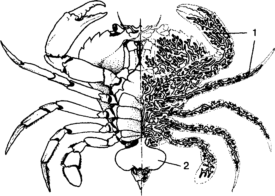 Саккулина:1 – тяжи клеток внутри тела краба; 2 – мешковидное тело, выступающее наружу