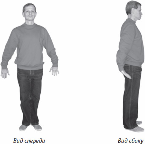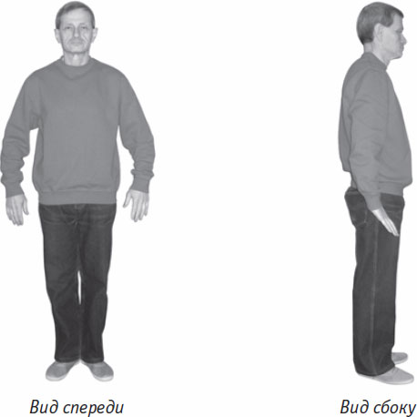 Руки свободно опущены книзу, ладони повернуты назад. На выдохе (с напряжением) нужно как бы надавить на стену, находящуюся сзади.