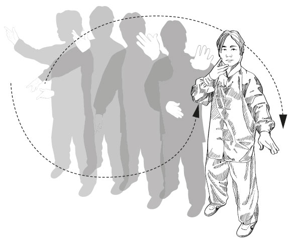 1. Описание движения: руки описывают перед собой, справа и слева, два больших круга, как будто вращают два больших колеса. Вы словно стоите перед стеной, на которой на уровне ваших ребер закреплены два больших колеса, которые нужно крутить в разные стороны. Правая рука вращает вправо по часовой стрелке, левая – против часовой стрелки влево. При этом руки движутся в разные стороны: когда правая поднимается к верхней точке окружности, то левая, наоборот, проходит нижнюю точку. Когда движение начнет хорошо получаться, можно уйти от образа с вращением колес и представлять, что ваши руки закручивает и несет ветер.