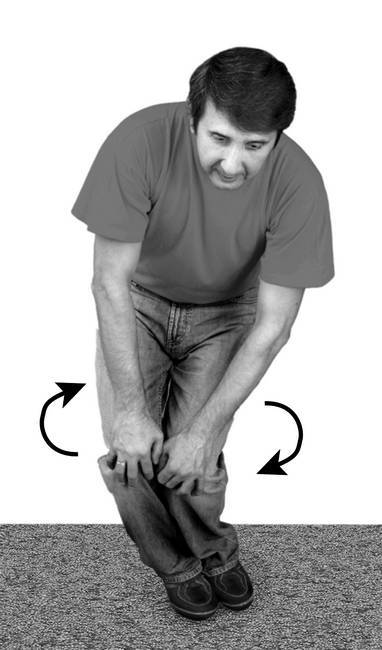 На счет «раз» резко согните ноги в коленях (колени толчком выдвигаются вперед) и коротко, шумно вдохните носом. Сразу же без паузы выполните круговое движение двумя согнутыми коленями вправо и в это время абсолютно пассивно выдохните. В конце кругового движения колени выпрямите. Затем на вдохе повторите резкий выпад коленями вперед, то есть слегка присядьте на обеих ногах, на пассивном выдохе снова выполните круговое движение коленями вправо и вернитесь в исходное положение. Туловище все время наклонено, как в упражнении «Насос», руки не отрываются от коленей.