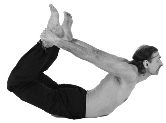 Исходное положение — лежа на коврике лицом вниз, лоб прижат к полу, ноги согнуты в коленях и разведены в стороны, кисти рук держат одноименные лодыжки.