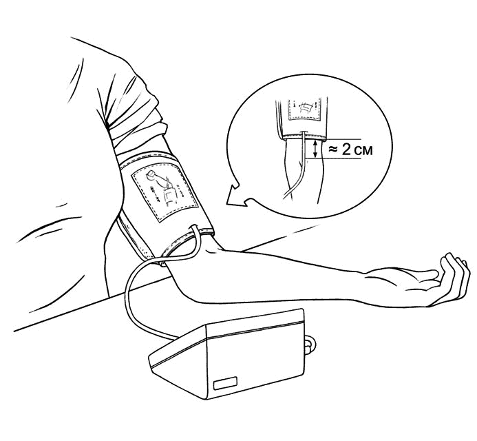 ? Закрепляя манжету, имейте в виду, что ее нижний край должен быть расположен примерно на 2 см выше локтевого сгиба. Резиновая трубка манжеты должна располагаться с внутренней стороны руки.