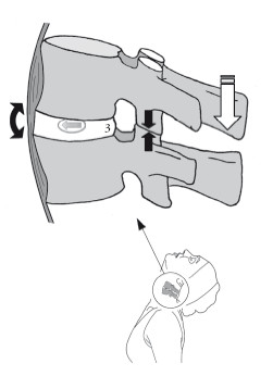 • При разгибании все происходит с точностью наоборот: позвонки сближаются сзади, а ядро смещается вперед вследствие сокращения высоты диска в задней части (3).
