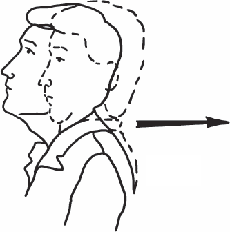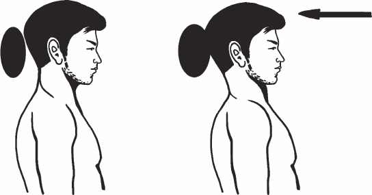 Встаньте спиной к стене, прижмитесь к ней ягодицами и лопатками. И теперь два очень важных движения. Первое – прижмите подбородок к шее, как бы втянув его назад. Второе – тянитесь макушкой вверх. И делать эти два движения нужно одновременно. И вместе с двумя этими движениями коснитесь затылком стены. Именно в этот момент работают длинные разгибали шеи без коротких (см. рис. 17).