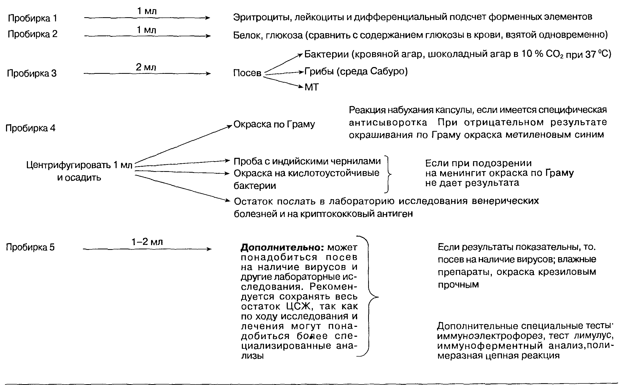 Вышеуказанные бактериальные инфекции обычно сопровождаются изменениями в ЦСЖ по типу А, при этом бактериемия имеет место в 50% случаев, а высевы из ЦСЖ положительны примерно в 90%. Поскольку посевы крови иногда дают положительный результат при отрицательных результатах посева ЦСЖ, то при обследовании больных менингитом посевы крови следует производить в первую очередь. Наиболее важным анализом является окраска по Граму, которая помогает диагностировать возбудителя в 80–90% доказанных случаев. Бывает, что окраска по Граму выявляет возбудителя даже в том случае, когда посев дает отрицательный результат, особенно если уже проводилось лечение антибиотиками. Другими полезными лабораторными методами считаются окраска с помощью метиленового синего или акридинового оранжевого, которая может выявить возбудителя даже при отрицательных результатах окрашивания по Граму. Реакция набухания капсулы микроба в присутствии специфических антител, противоточный иммуноэлектрофорез и метод непрямого иммуноферментного анализа (ELISA–тест) идентифицируют бактериальные антигены, а недавно разработанный метод полимеразной цепной реакции имеет огромные перспективы в плане идентификации специфической нуклеиновой кислоты микроорганизма, даже если последний уже нежизнеспособен.