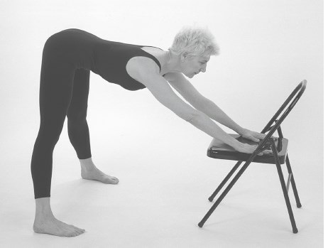 Адаптированный вариант Прасариты Падоттанасаны. Станьте, поставив стопы параллельно на расстоянии 90 см друг от друга. Наклонитесь вперед и положите ладони на сиденье стула. Как можно сильнее изогните спину. На первый раз оставайтесь в такой позе 10–15 секунд. Локти прямые; голова поднята вверх и по возможности отведена назад. С течением времени, продолжая практиковать эту позу, постепенно делайте подставку, на которую опираются ваши руки, все ниже, благодаря чему ваше тело будет наклоняться все ближе и ближе к полу.