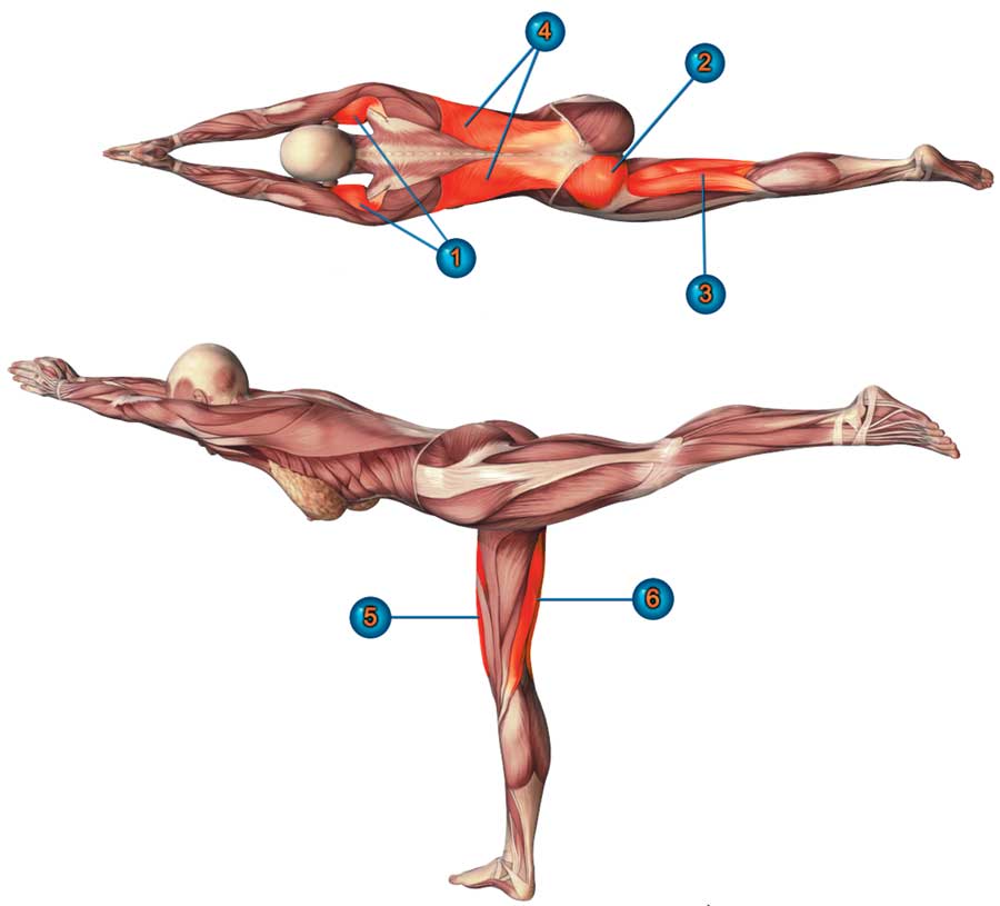 1 – дельтовидные мышцы, 2 – большая ягодичная мышца, 3 – задняя группа мышц бедра выпрямленной ноги; растягиваются: 4 – широчайшие мышцы спины;