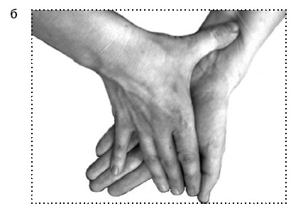 1. Сядьте на стул в естественном положении, выпрямите спину. Левая рука покоится на нижней половине живота, ладонь смотрит вверх. Большой палец правой руки надавливает наточку (фото 5, б). Начальное направление надавливания – прямо и вниз (до двух минут). Потом, не отрывая большой палец от точки, налавливаем по направлению к локтевому сгибу – всего выполним до сотни движений вниз и до сотни движений вверх.