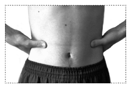 3. Если аритмия сопровождается недостаточным дыханием, используем для надавливания возбуждающие точки в подреберье (фото 5, в). Они расположены на расстоянии в ширину сомкнутой ладони от линии позвоночника. Выполняем ощутимое плотное надавливание одновременно на обе точки большими пальцами. Надавливание должно быть стандартным по времени (около 5–7 секунд), однако многократным.