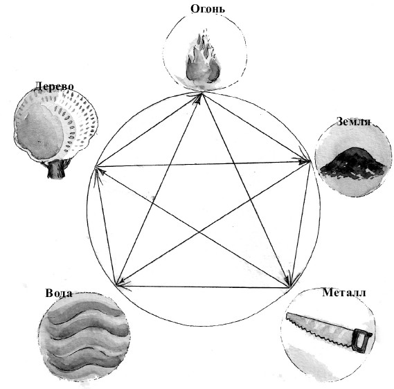 Получается круг созидания, в котором каждый предшествующий элемент создает последующий. И, наоборот, в круге разрушения вода заливает огонь, огонь растапливает металл, металл разрушает дерево, дерево истощает землю, земля засыпает воду