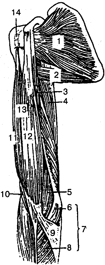 1 — подлопаточная мышца; 2 — большая круглая мышца; 3— клювовйдно-плечевая мышца; 4— трехглавая мышца плеча; 5, 10— плечевая мышца; 6 -- плечевая головка круглого пронатора; 7— круглый пронатор; 8— локтевая головка круглого пронатора; 9— апоневроз двуглавой мышцы плеча; 11 — длинная головка двуглавой мышцы плеча; 12— короткая головка двуглавой мышцы плеча; 13 — двуглавая мышца плеча; 14 — межбугорковое влагалище сухожилия длинной головки двуглавой мышцы