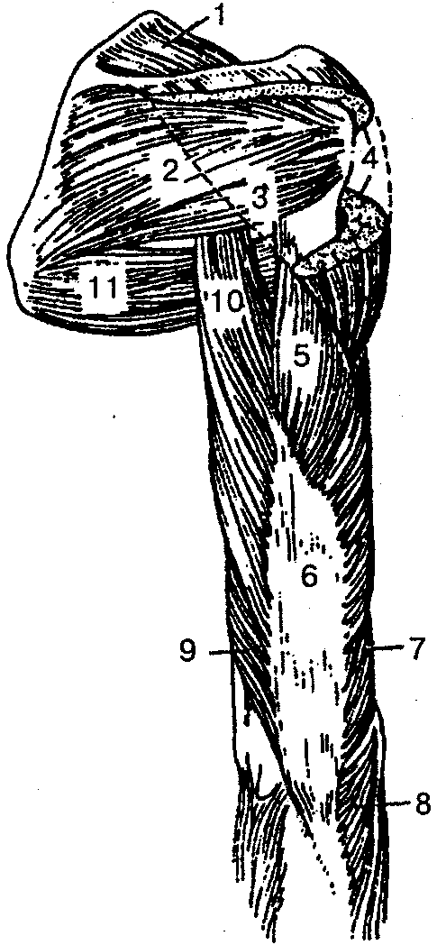 1 — надостная мышца; 2 — подостная мышца; 3 — малая круглая мышца; 4 — дельтовидная мышца; 5 — латеральная головка трехглавой мышцы плеча; 6 — трехглавая мышца плеча; 7, 9 — медиальная головка трехглавой мышцы плеча; 8 — локтевая мышца; 10 — длинная головка трехглавой мышцы плеча; 11 — большая круглая мышца
