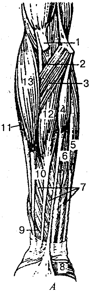 А — поверхностные: 1 — апоневроз двуглавой мышцы плеча; 2 — двуглавая мышца плеча; 3 — круглый пронатор; 4 — длинная ладонная мышца; 5 — локтевой сгибатель запястья; 6— плечелок-тевая головка поверхностного сгибателя пальцев; 7— поверхностный сгибатель пальцев; 8 — короткая ладонная мышца; 9 — квадратный пронатор; 10 — лучевая головка поверхностного сгибателя пальцев; 11 — длинный лучевой разгибатель запястья; 12 — лучевой сгибатель запястья; 13— плечелучевая мышца; Б — глубокие: 1 — апоневроз двуглавой мышцы плеча; 2 — глубокий сгибатель пальцев; 3, 6 — поверхностный сгибатель пальцев; 4 — квадратный пронатор; 5 — длинный сгибатель большого пальца; 7— супинатор; 8— двуглавая мышца плеча