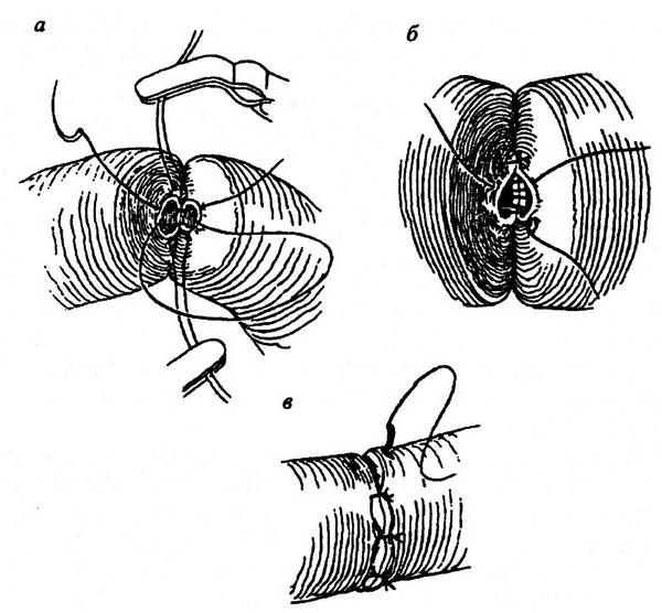 а – формирование задней губы анастомоза; б – ушивание передней губы анастомоза; в – второй ряд швов на стенку семявыносящего протока