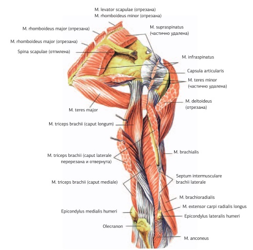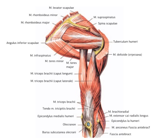 4. Стимуляционный тейпинг задней группы мышц плеча (рис. 32, а, б). (Трехглавая мышца плеча m. triceps brachii, локтевая мышца m. anconeus.)
