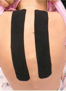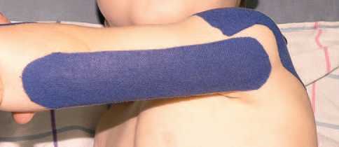 5. Стимуляционный тейпинг мышц плечевого пояса (рис. 33, а, б) (цель: стимуляция наружной ротации плеча). (Надостная мышца mm. supraspinatus, подостная мышца mm. Infraspinatus, малая круглая мышца m. teres minor.)
