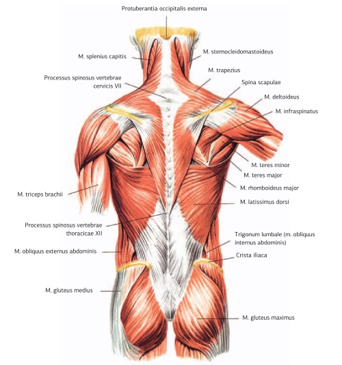 6. Стимуляционный тейпинг мышц, выпрямляющих грудной отдел позвоночника (основа: стимуляция мышцы, выпрямляющей позвоночник (ТОЛЬКО ГРУДНОЙ ОТДЕЛ m. erector spinae) (рис. 34, а-г).
