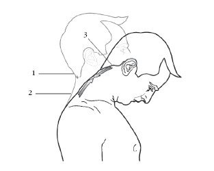 На рисунке цифрами (1) и (2) отмечено изначальное расстояние между началом и местом прикрепления и (3) – конечное положение начала. Стрелками указано направление вытяжения, провоцируемого увеличением тонуса.