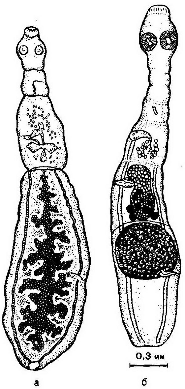 Пузырь (личиночная стадия эхинококка) заполнен прозрачной бесцветной жидкостью. Стенки его состоят из двух слоев – наружной толстой и внутренней зародышевой. Содержит эхинококковый «песок» – массу мельчайших зародышей – головок (сколексов) и нередко много мелких пузырей, так называемых вторичных, дочерних. При скармливании пораженных органов скота собакам происходит заражение последних.