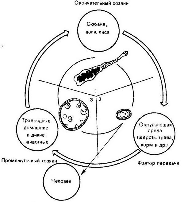 1 - половозрелая особь в организме окончательного хозяина; 2 - онкосфера в окружающей среде; 3 - эхинококковый пузырь в организме промежуточного хозяина.