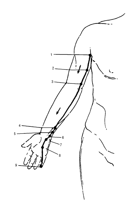 Рис. 23. Центробежный меридиан сердца:1 – цзи-цюань; 2 – цин-лин; 3 – шао-хай; 4 – лин-дао;5 – тун-ли; 6 – инь-си; 7 – шэнь-мэнь; 8 – шао-фу; 9 – шао-чун