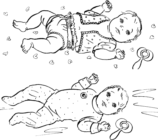 Рис. 154. а) Ребенок в более свободной одежде при температуре 24–26 °C б) при более холодной температуре – более одетый