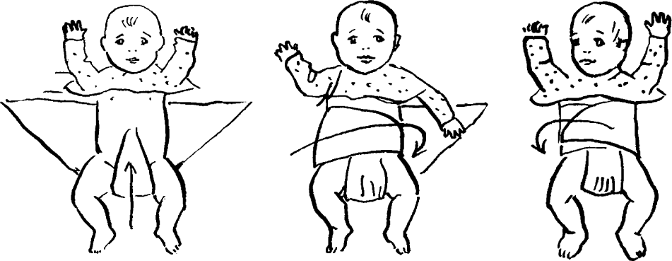 1) уложите ребенка и снимите подгузник, придерживая малыша одной рукой за ножки, и отложите подгузник в сторону;