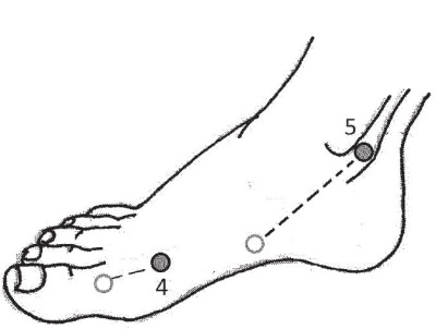 Зона 4 расположена в углублении на внутренней поверхности стопы, книзу и кзади от головки 1-й плюсневой кости, в месте перехода тыльной поверхности стопы в подошвенную (рис. 55, д). Основной эффект от воздействия на зону (в сочетании с другими быстринами) — снижение лихорадочных проявлений. Дополнительный эффект: лечение нарушений двигательной и чувствительной функции нижних конечностей и нижнего отдела позвоночника; лечение болей в области эпигастрия; уменьшение проявлений вегето-сосудистой дистонии (утомляемость, сердцебиение, подавленное состояние).