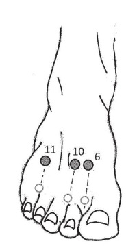 Зона 10 расположена во впадине между 2-й и 3-й плюсневыми костями, кзади от плюснефалангового сустава (рис. 55, е). Используется при болезнях желудочно-кишечного тракта; при болезнях водного обмена, вызванных дисфункцией выделительной системы (отеки лица, «мешки» под глазами, отеки конечностей); при лихорадке и ночных выпотах; при болях в стопе, коленном суставе и бедре.