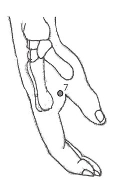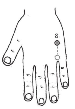 Зона 7 расположена в промежутке между проксимальной фалангой и пястной костью (рис. 55, б), поэтому и называется «третья в промежутке». Найти эту зону можно при слегка согнутой в кулак кисти на лучевой стороне указательного пальца, во впадине кзади от пястно-фалангового сустава. Эффект от воздействия: улучшение тонуса мышц; лечение болезней кишечника; лечение болезней легких (одышка, кашель, боль в грудной клетке); избавление от вялости и сердцебиения; уменьшение острой зубной боли.