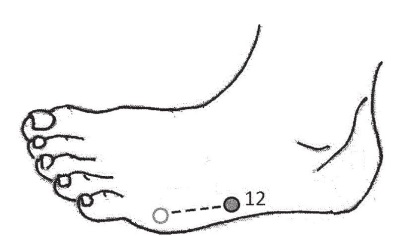 Зона 12 расположена в углублении книзу от головки 5-й плюсневой кости, на границе тыльной и подошвенной поверхности стопы (рис. 55, ж). На точку воздействуют при желудочно-кишечных расстройствах; при головокружении. Используют также при заболеваниях позвоночника, выраженных напряжением в затылочных мышцах, болями в пояснице, спине, тазобедренном суставе и нижних конечностях.