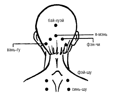 1. ФЭН-ЧИ (VB-20) находится на 1,5 цуня за сосцевидным отростком по направлению к средней линии головы.