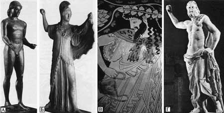 Рис. 1.3. Античные боги, прибегавшие к «биотеррору». А. Апполон (помогал троянцам). Б. Афина (была на стороне греков). В. Дионис (во время войны страдал безумием, но по ее окончании выздоровел). Г. Посейдон (помогал троянцам)