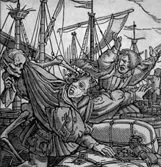 Рис. 1.5. «Купец» («The Merchant»)». Цветная гравюра на дереве Ганса Гольбейна Старшего (1460–1524) из цикла «Пляска смерти» («The Dance of Death», 1538). Картина показывает купца, схваченного смертью в благодарность за доставленный товар. Выбор в качестве фона морского порта обусловлен тем, что в те годы именно купеческим кораблям приписывалась основная роль в распространении чумы (The Granger Collection, New-York)