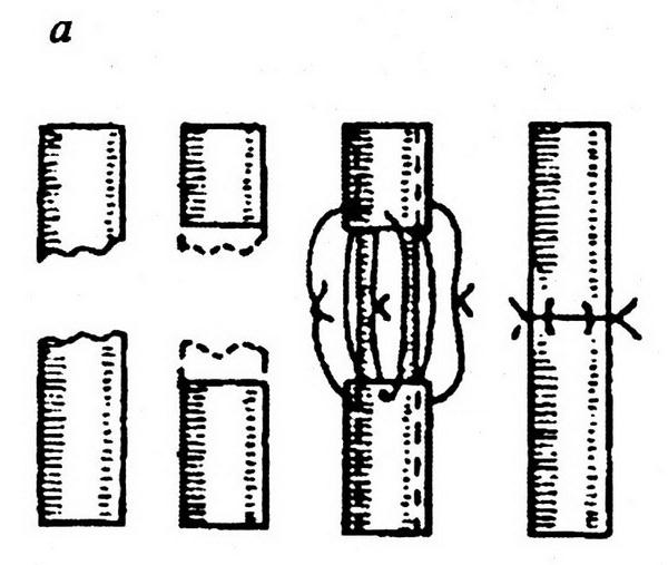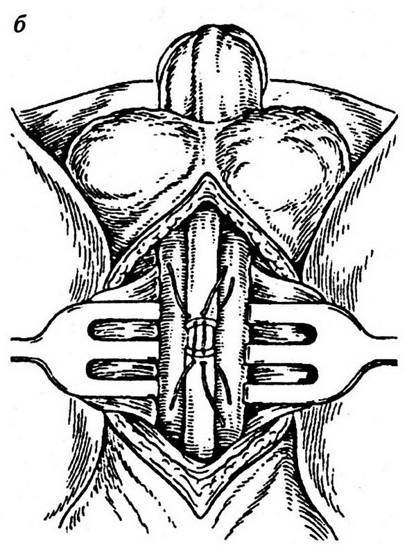 а – схема подготовки концов уретры для формирования анастомоза; б – первичный шов уретры формированием анастомоза «конец в конец» (по Н. А. Лопаткину, 1998)