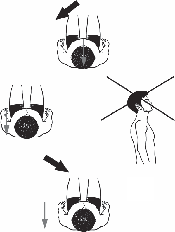 Давить затылком нужно строго назад, не запрокидывая голову. Подбородок прижат к шее.