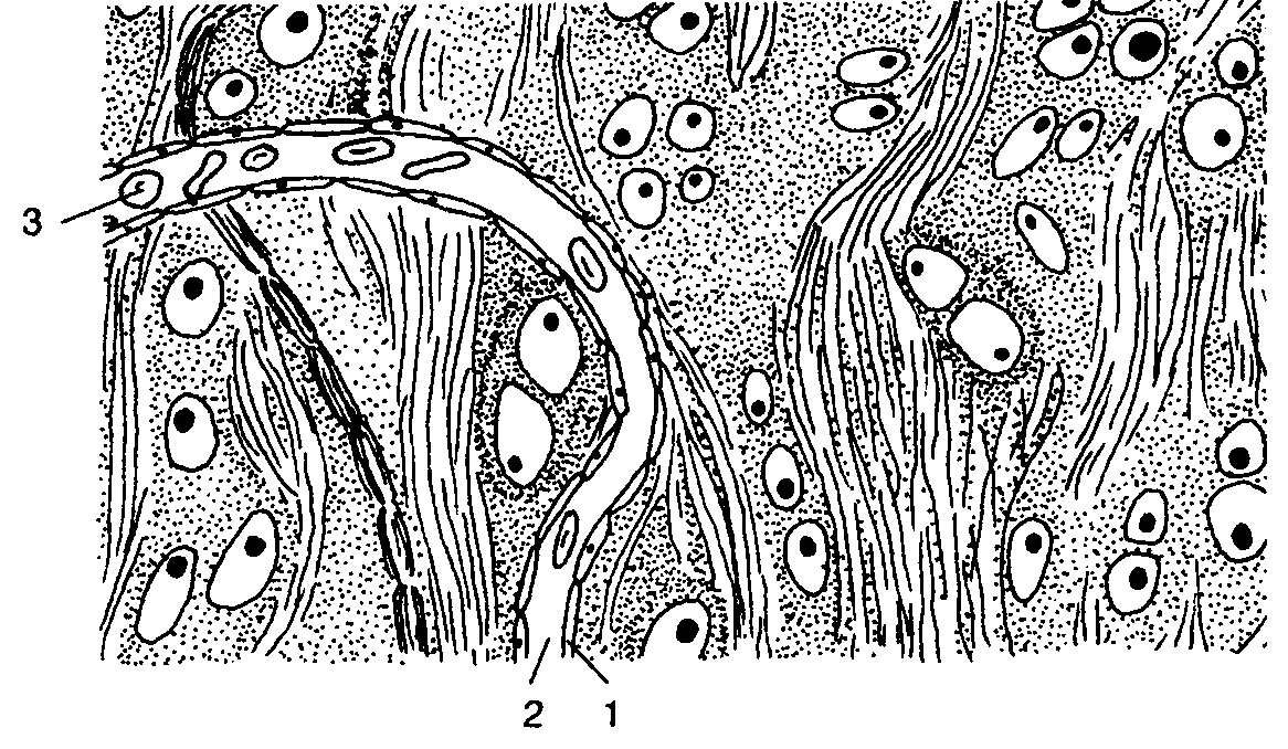Капилляр в хрящевой ткани: 1 – стенка капилляра; 2 – просвет капилляра;3 – эритроциты