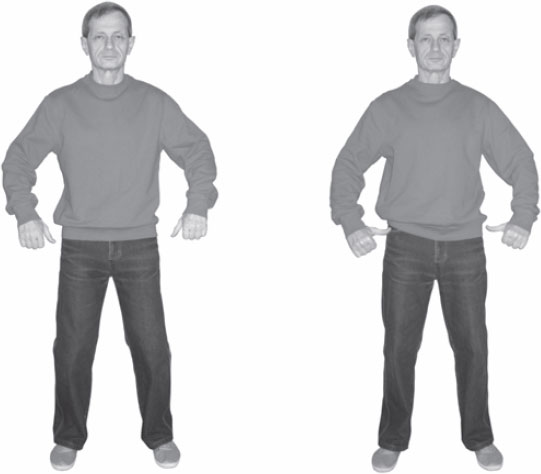 На вдохе расслабиться и опустить (отпустить) большие пальцы книзу, руки в локтях немного сгибаются, возвращаясь в исходное положение.