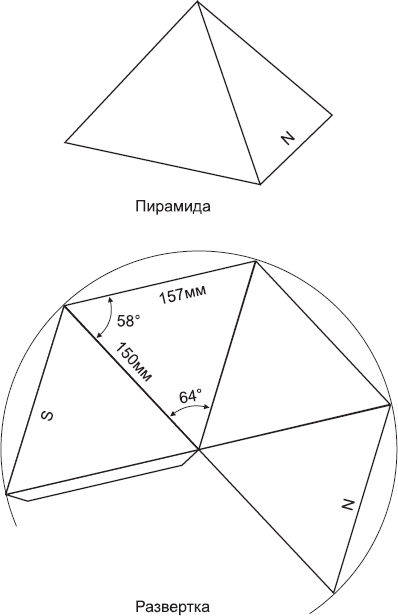 Это так называемая «пирамида Дрбала». Автор склеил две модели из цветной бумаги (для красоты), на гранях изобразил древнеегипетские иероглифы и поставил одну в изголовье кровати, другую – в рабочем кабинете в экологической коллекции, предназначенной для воспитания молодых профессиональных экологов. Модель следует ставить строго на север, как показано на рисунке, подальше железобетонной арматуры. Если модель монолитная, в ее грани, ориентированной на север целесообразно просверлить 4 отверстия в виде треугольника.