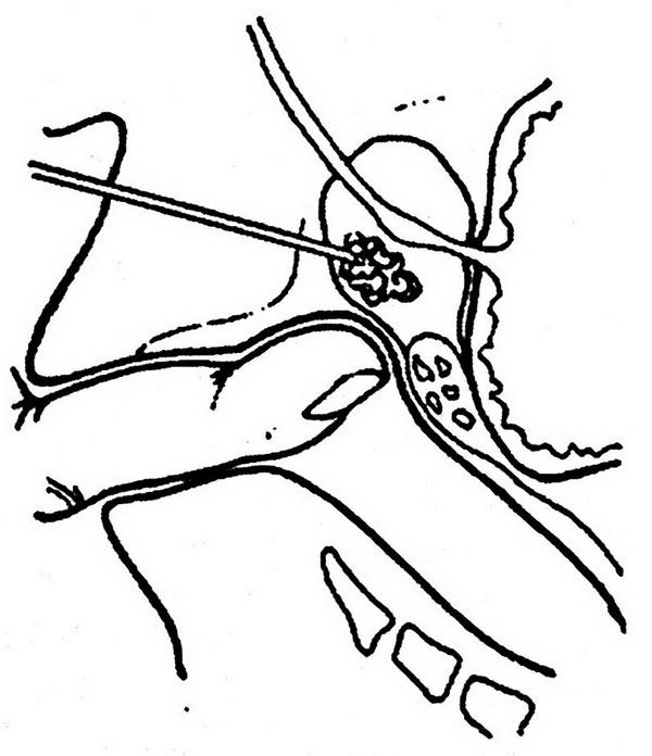 Рис. 6.5. Промежностная пункция абсцесса предстательной железы