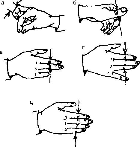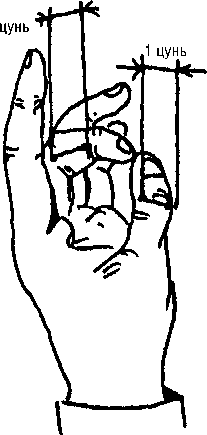 Кроме пропорциональных цуней для точного определения искомых точек на поверхности тела применяют индивидуальный цунь, то есть размер ширины отдельных пальцев кисти (рис. 4).
