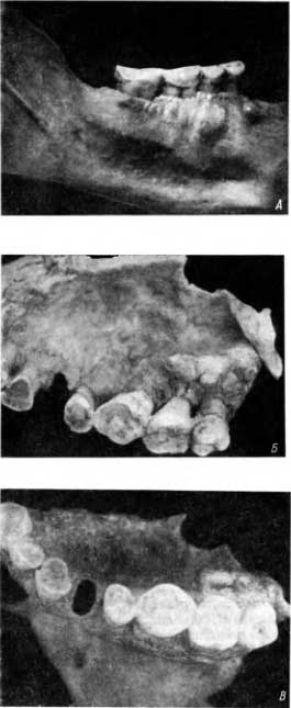 На рис. 89, А представлено такое неравномерно выраженное утолщение на нижней челюсти, на внутренней (ротовой) ее стороне. На этом протяжении зубы и челюсти без патологических изменений (челюсть из погребения в старой Вятке).