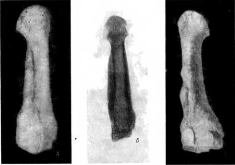 Между тем, как это видно на исследованных нами плюсневых костях (рис. 90, А, Б, В), новообразованная кость прилегает к старой кости как полуцилиндр к цилиндру (рис. 90, А). На каком-то протяжении новообразованная кость несколько отстоит от старой кости, находясь с ней в значительной мере лишь рядом. Эта особенность обнаруживается в диафизе плюсневых костей, имеющем, как известно, 3 стороны, или грани, и 3 края. Новообразованная кость прилегает не к той или иной грани диафиза, а к тому или иному краю диафиза.