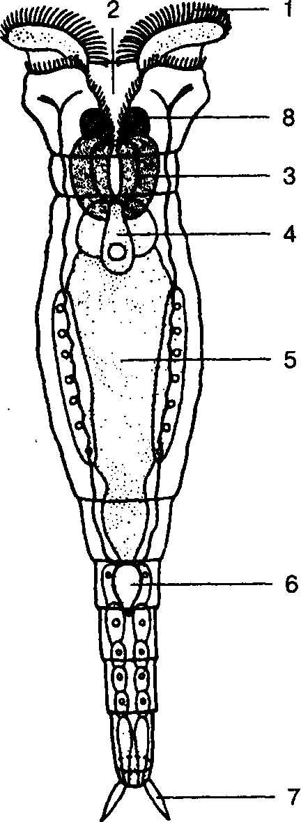 Коловратка:1 – коловращательный аппарат; 2 – рот;3 – глотка с жевательным аппаратом;4 – пищевод; 5 – желудок; 6 – задняя кишка; 7 – пальцы ноги; 8 – надглоточныйганглий