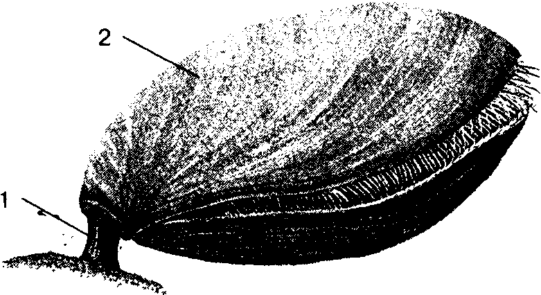 Брахиопода: 1 – ножка; 2 – раковина