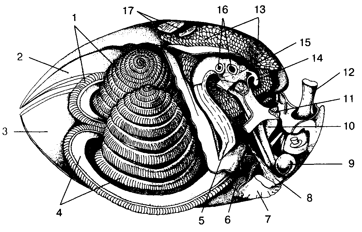 Анатомия бракиоподы(продольный срез, животное вынуто из раковины):I – правая «рука»; 2 – спинная складка мантии; 3 – брюшная складка мантии; 4 – левая рука; 5 – пищевод; 6 окологлоточная нервная система; 7 – мускул–размыкатель раковины; 8 – мускул–замыкатель раковины; 9 – задняя кишка; 10 – нефридий; 11 – его воронка; 12 – ножка; 13 – печёночные дольки; 14 – сердце; 15 – желудок; 16 – отверстия протоков «печени»; 17 – мускулы–замыкатели